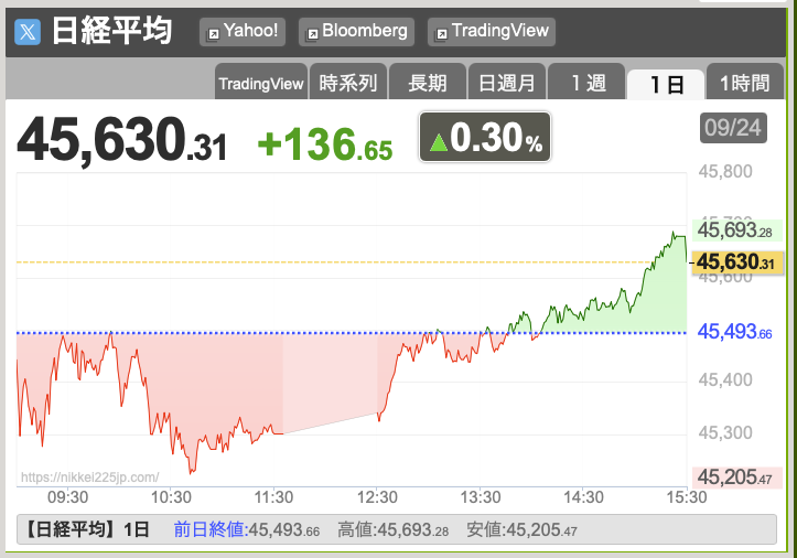 本日の日経平均株価は、前の日に比べて136円65銭あげて、45,630円31銭で取引を終え、連日で最高値を更新した。主な上昇要因として、ソフトバンクグループの大型投資への期待感が、市場全体の書いムードをを後押しした。