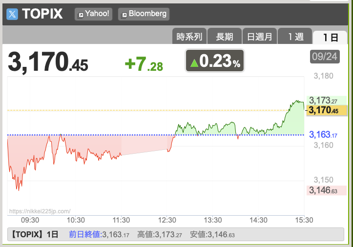 本日15時30分のTOPIXは、前の日に比べて7.28ポイント上がって、3170.45ポイントとなりました。僅かな上昇の原因は、日経平均株価と同じだが、TOPIXは東証プライム全銘柄と広範囲な指数のため、日経平均よりも上昇がやや上昇が控えめな傾向になる。