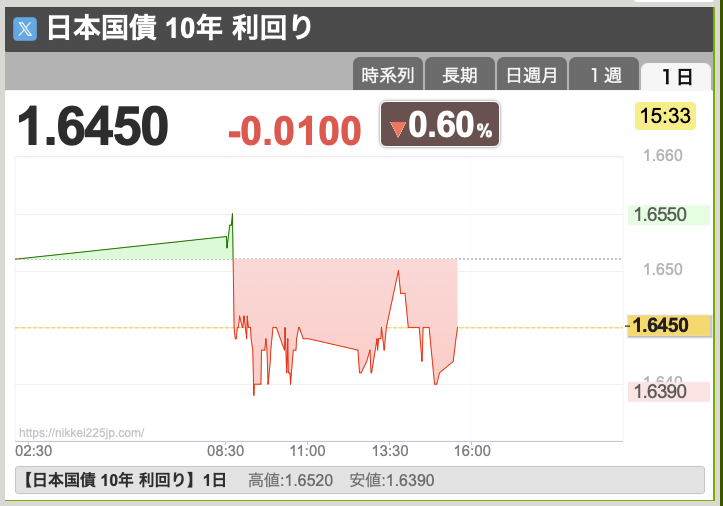 本日15時30分頃の日本国債10年利回りは、前の日に比べて上昇し、1.6450となりました。この利率の低下は、米長期金利の低下により、下がった。