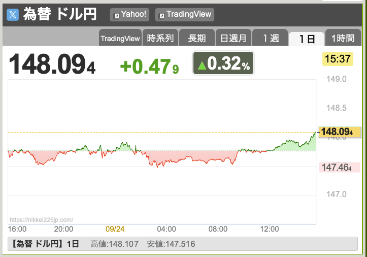 本日15時30分頃のドル円為替は、前の日に比べて4.78銭高い148円9.4銭となっています。日経平均の上昇に対して、ドル円は手がかりが乏しく、米金利低下がドル売りをしたが、テック株が為替に及ばす安定。