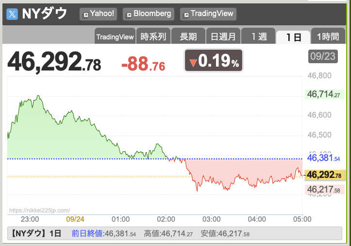 本日のニューヨーク株式市場のダウ平均株価は、前の日から88ドル76セント下がって、46,292ドル78セントになりました。米中間の貿易摩擦再燃への懸念やテック株の一部調整がダウ構成銘柄に影響を与えた。