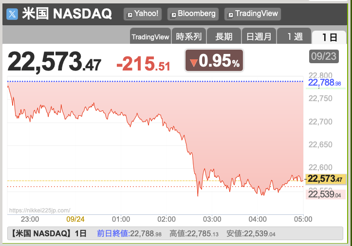 本日の米国ナスダック総合は、下落はNYダウと同じで、テック株中心のナスダックが敏感に反応したことによるもの。
