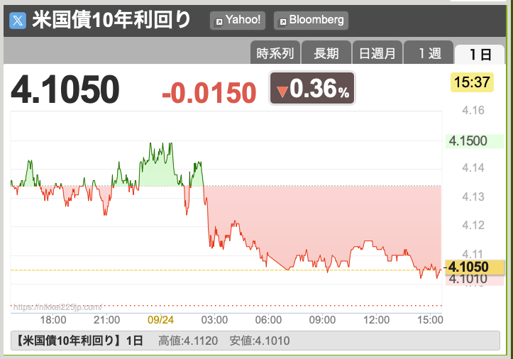 本日15時30分頃の米国債10年の利回りは、4.105%でした。経済指標の軟調さが再燃し、投資家が安全資産へのシフトを強めたため。