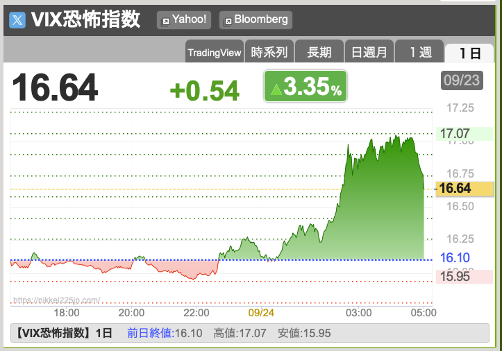 本日15時30分頃のVIX恐怖指数は、16.64ポイントで、市場の安定を示唆しています。