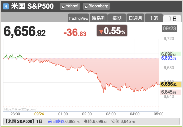 本日の米国S&P500は、前の日から36ドル83セント下げて、6,656ドル92セントになりました。下げの理由は、ナスダックと同じで、市場全体のリスクオフムードが強まり、テック株や金融株を中心に利益確定売りが優勢となりました。