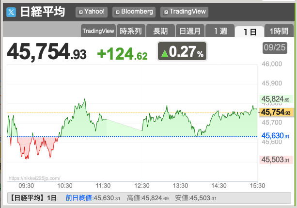 本日の日経平均株価は、前の日に比べて124円62銭上昇して、45,754円93銭で取引を終えました。これで3営業日連続で史上最高値です。AI関連の銘柄が日経平均を押し上げました。ソフトバンクグループや東京エレクトロンなどが上昇。
