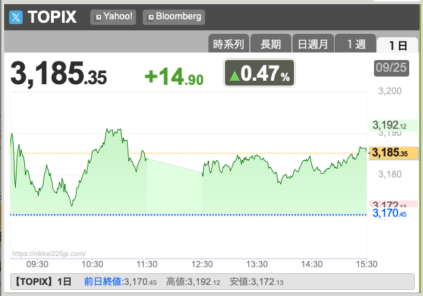 本日15時30分頃のTOPIXは、前の日に比べて14.90ポイント上がって、3,185.35ポイントとなりましてた。上昇の原因は、円安傾向にあること。9月配当・優待の権利とりを狙った買いがあったこと。
