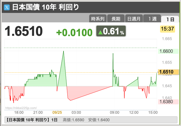 本日15時30分頃の日本国債10年利回りは、前の日に比べて上昇し、1.6510となりました。