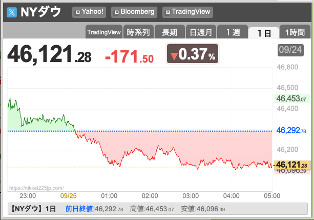 本日のニューヨーク株式市場のダウ平均株価は、前の日から171ドル50セント下がって、46,121ドル28セントになっています。下落した原因はいくつかあるが、その一つとして、パウエル議長が前日に「資産価格が相当に割高になっている可能性がある」と述べたことが、投資家に警戒感が広がりました。
