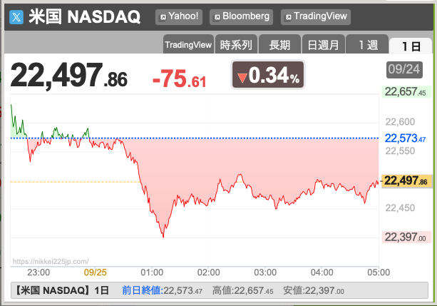 本日の米国ナスダック総合は、前の日から75ドル61セント上がって、22,497ドル86セントになりました。NYダウ下落と同じような事が起きており、特にテクノロジー・グロース株の影響を強く受けた事です。