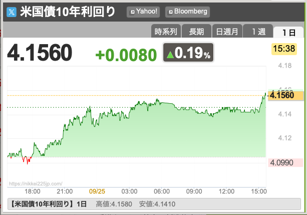 本日15時30分頃の米国債10年の利回りは、4.1560%です。この動きは、米国債市場の安定を反映していて、大きな変動要因はないと思われます。