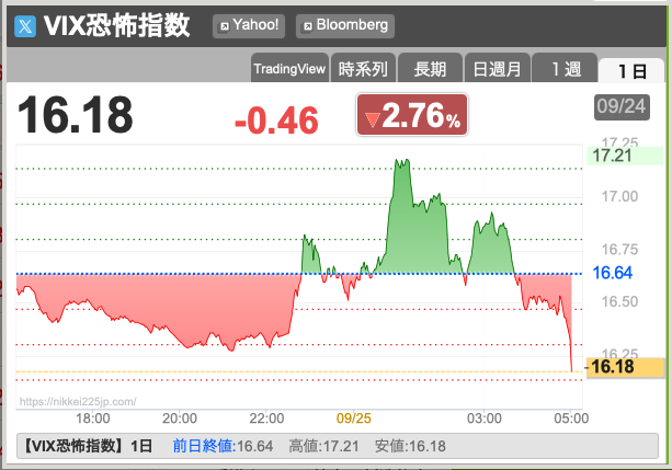 本日15時30分のVIX恐怖指数は、16.18ポイントで、ほぼ市場の安定を示唆しています。