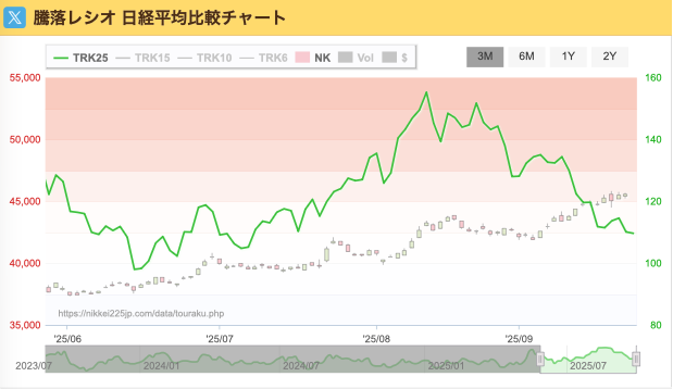 本日15時30分頃の騰落レシオは、前の日に比べて0.44下がって、109.63%となっています。市場はだいぶ落ち着いて来た。
